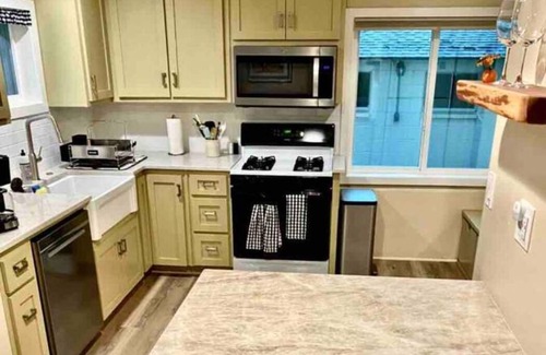 With 2 bedrooms (1 king and 1 queen) and 1 bathroom, the house is perfect for 2-4 guests. However, there is also a sofa sleeper in the living room so the house can actually sleep up to 5, if needed.