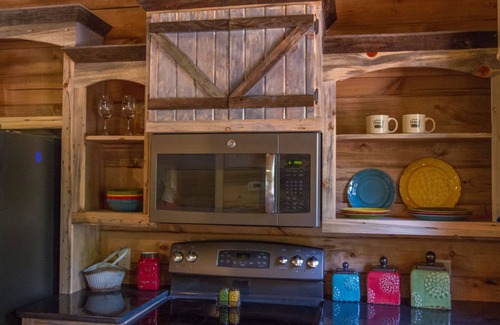 As you make your way throughout Wood Knot, you'll notice the little details that were put into every bit of decorating the cabin. Many of the features were taken from an old barn dated back as early 1940's. The wood was made into cabinet trim, wall fixtures, and a beautiful 4 foot sliding barn door separating the bedroom and living room. The bedroom has a king size log framed bed, 42 inch flat screen TV with DVD player, and French doors that open out onto the back deck. The bathroom has custom built barn wood vanity with granite top and vessel sink, custom made mirror and linen closet. The beautiful walk in shower is lined with rock style tile and a rustic tin ceiling.