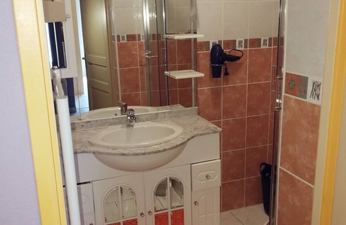 a bathroom with shower and set sink cabinet with hair dryer and additional heating towels are available in the furniture