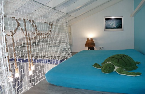 This "Marine" room is air conditioned, designed to accommodate up to 5 beds (3 on the mezzanine), bathroom with walk-in shower, WC, smart TV, wifi, safe ,. It also benefits from its private entrance on the terrace side.