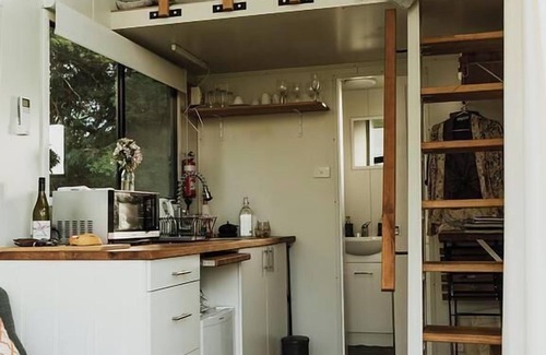 The tiny house has a queen-sized bed in the loft sleeping 2 adults and a couch on the ground floor converting to a double bed sleeping 2 children. It's a cozy 170-square-foot tiny home with easy access to water, split air conditioning, a kitchenette with a portable cooker, cooking utensils, and cutlery. Microwave, mini fridge, and excellent bathroom facilities. These amenities include an eco-friendly compost toilet, hand basin, and shower (gas-heated for hot showers) for your use.
