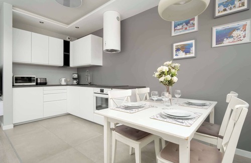 This modern and stylish apartment is designed for four people. The unit has a furnished balcony with a table and chairs, where you can drink your morning coffee and relax in an intimate atmosphere. This is a great place to relax for couples, groups of friends, participants of business trips, as well as parents traveling with their kids. In the living room stands a dark gray double sofa bed, cabinets ideal for storing handy trinkets, a desk with an office chair for comfortable remote work, a dining table with chairs and a white table where you can have a snack while watching your favorite programs on a large and modern flat-screen television. Meals can be conveniently prepared using the functionally furnished kitchenette. It has to offer such appliances as a toaster, microwave, oven, capsule coffee machine and electric kettle. The comfortable and elegant bedroom is equipped with a large and comfortable double bed, a closet, as well as a capacious closet, where guests can keep the clothes and other items they have brought. The bathroom has a modern clear shower, a washing machine, a hair dryer and a welcome toiletries set with towels. The bright and spacious apartment looks very tasteful. The arrangement is subdued and dominated by shades of beige, white and gray. The decor does not lack carefully selected decorations and colorful accents.