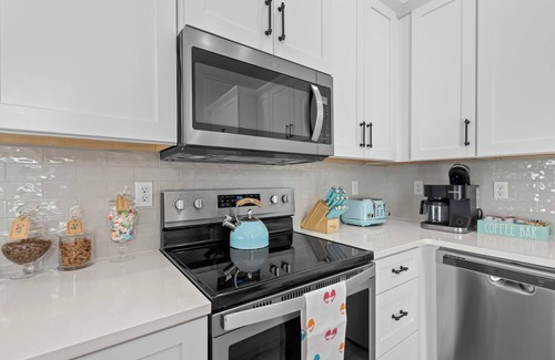 When you are ready to go to the beach, load up the wagon, hit the crosswalk button on the light, head across the street to the path to the beach. White sands and sparkling blue water await you. After a day in the sun, you can head back across the street, grab some ice cream at Pete's Ice Cream shop, rinse off in the outdoor shower, and settle in for the evening.