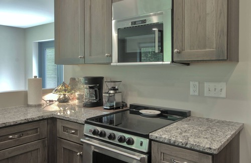 Behind the sitting room is the kitchen. It’s got the full lineup of appliances: stovetop and oven, microwave, fridge and freezer, and even a dishwasher! We’ve also got a complete setup for your morning coffee, and we stock the house with beans from our friends at Lake Wind Coffee in Port Wing. There’s a peninsula countertop that gives you some extra prep space, and also has bar seating for four when it’s feeding time. Speaking of kitchens, we know a lot of food producers on the South Shore, and we’ll deliver fresh, locally-produced foods—meats, fish, veggies, and more—to the house! Just get in touch with us before you check in.