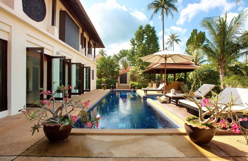 Beautiful three bedroom private pool villa a 2 min walk from Bangrak Beach in a quiet gated community with 24/7 security. 350 sqm living space. Very private & romantic luxury villa with large sala, 10 m pool, jacuzzi and outdoor shower in a tropical garden. A quiet, serene oasis 5 min from bustling Fishermans Village, 15 min from the airport. Beach club with sun loungers, large swimming pool and restaurant close by (200 m walk along the beach).