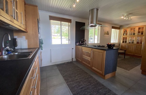 The house has an open kitchen with a dining place for six to eight people. The kitchen is fully equipped. It overlooks both the front and the rear of the house.