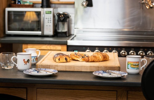 The kitchen area is open plan and overlooks the living area and dining room. Separated by a breakfast bar with 2 stools. The kitchen is fully equipped with crockery, cutlery, utensils and all the cooking essentials you could imagine to create a family feast to share at the dining table. There is a good sized centre preparation island, with lots of storage drawers and cupboard space. The kitchen boasts a large Miele fridge freezer, a dishwasher, and all the other kitchen appliances such as a toaster, kettle and a coffee machine for your use. There is also a cloakroom / utility room off the hall which has a washing machine and tumble dryer for your use. There is room here to leave boots and coats.