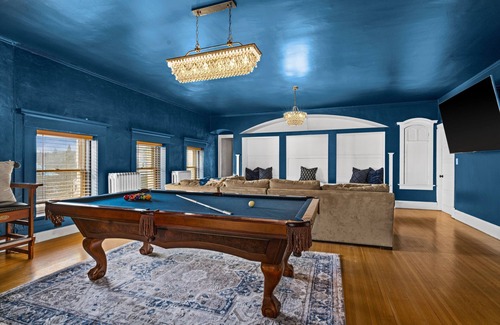Indulge in the ultimate relaxation in the Billiards Suite, a luxurious 1,100 sqft 2-bedroom retreat that captures the essence of lounge-inspired living. Each bedroom offers the comfort of a king-sized bed, while the living area boasts a large sectional couch, perfect for lounging in front of the massive 85-inch TV. Warm up by the fireplace or whip up a gourmet meal in the full chefs kitchen; this suite is designed to cater to every whim. Whether you're here for leisure or business, the Billiards Suite at Cotton Mansion promises an unforgettable stay.