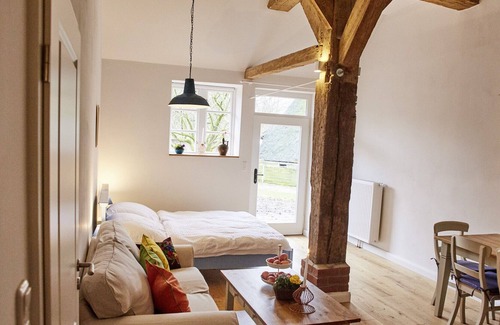 Hof Eggers is a historic organic farm that has been family-owned since 1628. We operate according to Bioland guidelines. Grain is grown on the farm and there is a herd of cattle, pigs, sheep, chickens, geese. In the summer months, our farm shop cafe opens with delicious homemade cakes. A garden can be used, with seating, it can be grilled. The apartment is located on a historic but still fully managed organic farm. There are cattle, pigs, chickens, geese, ponies, sheep, cats and a dog. On weekends there is coffee and homemade cakes in the farm shop cafe. The fields can be explored on the organic circular hiking trail. We and our employees live on the farm. On Fridays (only during the Hofcafe season) there is a common cake table in the Hofcafe. There is the possibility to ride our ponies on fixed dates or to help feed the animals. Suitable for friends of the rural way of life, nature and organic farming, which also does not disturb the sounds and the smell of animals, a manure in the yard and a paved yard. Our organic farm is still under cultivation. We have green electricity and our heating is powered by wood from the farm, water comes from our own well.