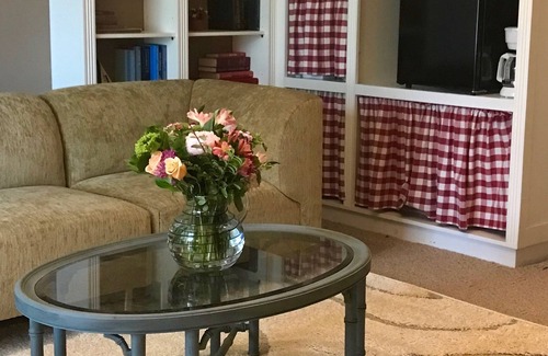 "Birch" is a private retreat, part of a lovely cottage hidden behind an ornate garden gate; It is a cozy and comfortable private apartment for 2-4 guests comprising of two large and well-appointed rooms with modern touches within a ridiculously charming Door County setting! The "Green Gables" the property in which it is set, is a picturesque spot in the north part of Ephraim, with its own beautiful award-winning gardens, and is within easy walking distance to galleries, shops, mini-golf, breakfast and pizza, or a short drive from Ephraim village and the water. "Birch" gets lots of natural light from a large picture window at the front and from a sliding patio door at the back, which opens onto a small garden area with summery flowers. There's plenty of more open green space outdoors and around the Green Gables property. One large room has an elegant King bed, while the living room has a true Queen sofa-bed. The living room has a large and attractive library of books plus a 49" TV (with cable, Netflix, and Amazon Prime). All the bedding is non-allergenic. There is a very spacious walk-in shower enclosure within an ensuite bathroom. The apartment also is equipped with modest kitchenette facilities consisting of a microwave, fridge, toaster, coffeemaker and simple tableware/utensils. A contemporary dining table and four chairs completes the apartment, a lovely place to unwind and from which to explore Door County. In response to COVID-19, cleaning and sanitizing will be thoroughly undertaken, and guests are asked and to be ready to put on masks just when entering and exiting the building. Thank you!