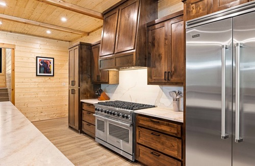 Bison's Bend is a brand new, 8-bedroom, 9.5-bathroom, 6230 square foot majestic oasis located about 10 miles north of Hochatown, OK. You will fall in love with this immaculate work of art! With a kitchen designed to make even the most seasoned chef stand in awe, you will find a coffee pot that takes fresh coffee beans and grinds them for a delicious cup of coffee! This spectacular cabin has a large spacious living area, 6 king bedrooms with ensuite baths and 1 king that shares a bath with the media room, a 6-bed bunk room with ensuite bath, and 5 sleeper sofas, so there is something for everyone and room for 28 guests! 5 TV's have cable and the rest are streaming. Relax in the hot tub, grill some steaks or burgers on the propane grill, or prepare the rest of your fare in the outdoor kitchen! This modern marvel is so inviting you will never want to leave your woodland oasis at Bison's Bend!