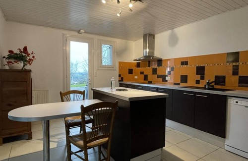 Apartment on the ground floor of the owners' house, with independent entrance and private outdoor spaces not overlooked. House located on the Chemins de St-Jacques de Compostelle, quiet area on the heights of the city (nice view). Equipped kitchen (fridge-freezer, microwave, induction hob, electric oven, dishwasher). Living room, lounge area (TV, WIFI internet connection). 2 bedrooms (1 double bed, 2 single beds), shower room (washing machine). WC. Oil central heating included. Sheets provided, beds made. Possibility to rent bathroom linen. Parking, large courtyard, terrace under the trees, garden furniture, plancha. Many hikes from the cottage, possibility of visiting the owners' farm nearby (cattle).