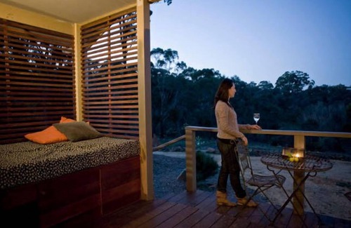 Dusk Spa Villa is a self contained, contemporary design open plan villa with its own double spa bath, double sauna, fireplace and kitchen, living, dining, romantic bedroom with a beautiful canopy King Size bed and bathroom that flow from one area to another. It is very restful and very private. From the lovely comfy couch you can easily access your LCD Digital TV, DVD, and a selection of DVDs. There two showers: an indoor delightful Italian tiled shower and an outdoor shower as part of the outdoor room with a Mexican pine tree that you look onto from the double spa bath in the bathroom; there is also a day bed on the veranda with great views to the forest and creek valley.