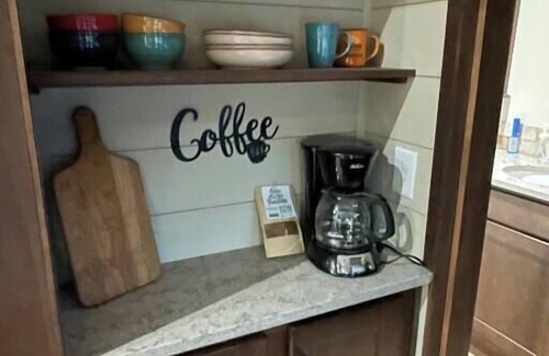 The Blue Heron Hut is a unique place and has a style all its own. Open entry and view of loft above. Full kitchen with appliances, granite countertops, pretty cabinets, coffee bar, and a nice dining space. Convenient pocket doors to the bathroom and the Queen master bedroom. The steps/ladder lead to the loft with both a full and a twin bed. Surprising storage space and full of charm. The outside is enjoyed from the covered front porch with rocking chairs to take in the perfect sunset!