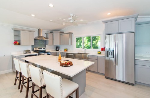 The fully equipped kitchen features new cabinets, modern stainless steel appliances, and an island counter with breakfast bar seating for four. Dishes, cookware, glassware, and cutlery are all provided.