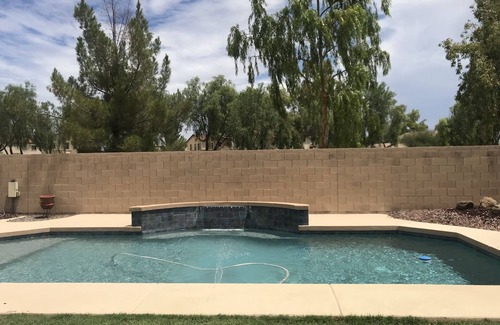 Large home with covered patio with sitting area, BBQ and outdoor pool. Four bedrooms and 2.5 baths with 2 car garage. AC in home, ping pong table spike ball, corn hole , board games and 2 TVs. Big kitchen with keurig and coffee close to Spring training, tennis/aquatic center, hiking, shops, restaurants and freeway.