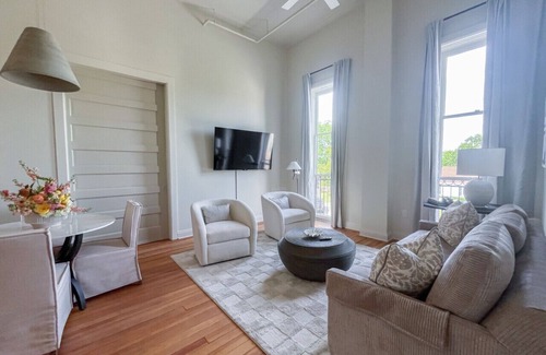 This beautifully styled unit complete with old heart pine flooring and preserved antique doors, features a plush king bed in the bedroom and a queen pull-out sofa in the living area, making it ideal for couples, families, or friends. Enjoy sweeping views of historic downtown Demopolis and iconic Rooster Hall from the comfort of your living space.