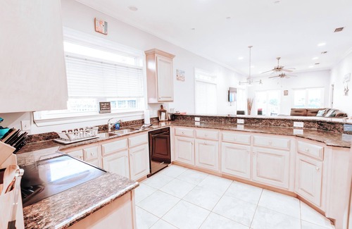 The kitchen is fully stocked with all appliances and plenty of counter space for prepping meals. The bonus laundry room includes a full-sized washer & dryer, counter space and shelving. Wet bar with sink. Kuerig and coffee maker available as well.