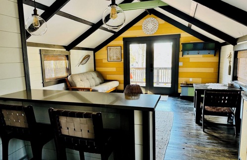 The Boho is a studio-style canvas glamping cabin with stylish interiors, modern conveniences and all the creature comforts you miss on your traditional camping vacation. Enjoy the luxury of a well-equipped kitchen (Keurig, microwave, air fryer & refrigerator) for home-cooked meals, a private bathroom with hot running water, a futon and a comfy king sized bed with fine linens to sleep soundly, with nothing but the sounds of nature.
