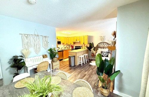 We added boho touches to a homely mountain vibe. Providing a full kitchen with all utilities, 2 bathrooms and 2 large bedrooms all tastefully and stylishly decorated.