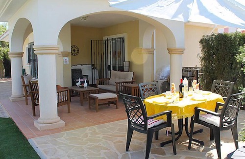 Campo de Golf Bonalba: Large, modern, comfortable resort "Bonalba Golf, Urb Los Naranjos", 2 storeys. On the outskirts, 5 km from the centre of San Juan-Campello, in the district Bonalba Golf, in a quiet, sunny position, 5 km from the sea, 5 km from the beach, on the golf course. For shared use: property (fenced), large garden with lawn 35 m2, swimming pool (4 x 7 m, depth 110 - 190 cm, seasonal availability: 01.Jun. and 30.Sep.). Tennis (extra). Private: beautiful garden 450 m2 (fenced), swimming pool (seasonal availability: 01.Jan. - 31.Dec.). Outdoor shower, patio, pergola, garden furniture, barbecue. In the complex: restaurant, bar, WiFi, spa area (all extra), shopping facilities. Parking at the house. Shop, grocery, restaurant 300 m, bus stop 300 m, railway station "Alicante" 10 km, sandy beach "San Juan/El Campello" 5 km. Sports harbour 10 km, golf course (18 hole), tennis 100 m. Nearby attractions: Terra Mitica 38 km, Terra Natura 38 km, Aqualandia 38 km, Alicante 19 km, Benidorm Palace 38 km, Aeropuerto de Alicante 30 km. Please note: car recommended. The complex has night security. Additional accommodations can be booked. Property ref. ES9749.303.1 is situated on the same property.