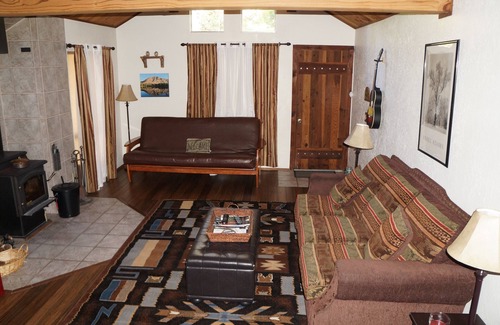 This 1150 square foot home has two bedrooms and two full baths and is not your typical old rundown cabin. This updated home has tons of mountain charm with knotty cedar ceilings, plank bamboo floors. It has been cosmetically remodeled with fresh paint, new floors and granite counters in the kitchen. The two bedrooms have brand new queen mattresses and very nice/new “lodge” style furnishings. Check out the pine log bed in the upstairs master bedroom and the Ranch decor in the downstairs bedroom. Both bedrooms and the living room have ceiling fans for your comfort during warm weather. In both bedrooms and the living room, we recently installed mini split air conditioning systems for your Summer comfort! We also have central heat and a fireplace for Winter comfort.