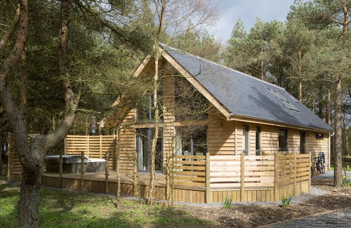 Wow! Luxurious lodge with a wonderful hot tub, set in beautiful woodland with stylish accommodation and a veranda for dining outside - bliss!