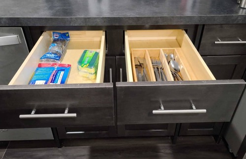 -A beautiful open kitchen embedded in this recreation room with a full set of appliances (Tea kettle, toaster, Air Fryer, microwave, refrigerator) and other necessities like plates, cups, glasses, utensils, and cleaning tools/supplies.