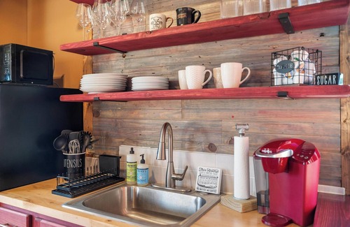 The Bunkhouse downstairs floor has a large bunk area with 2 queens down and 3 single beds above them and the cozy upstairs loft has a queen bed. There is also a fully equipped kitchen with all amenities and a large full bathroom.