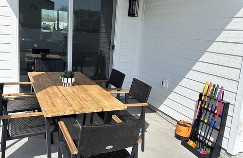 Welcome to our brand new, family-friendly 3-bedroom, 2-bathroom home! This modern retreat is perfect for your next getaway, offering a cozy, stylish atmosphere for all. For entertainment, head to the game room, where everyone can enjoy hours of friendly competition. The backyard is a true highlight— including a 3-hole putting green, outdoor seating for family meals, and relaxation. This home is the perfect blend of modern amenities and family fun. You're sure to create lasting memories here! Inside, the open-concept living area is filled with natural light, offering a spacious and inviting atmosphere. The comfortable living room features plush seating, perfect for movie nights or unwinding after a day of adventures. The sleek, fully-equipped kitchen is ideal for preparing meals, with modern appliances, plenty of counter space, and all the essentials you need to make meals. Enjoy eating together at the spacious dining table or take a quick snack at the breakfast bar. The three bedrooms are thoughtfully designed to cater to all your needs. The master bedroom features a cozy king bed and ample closet space, while the other two bedrooms are equally inviting with comfy beds and playful touches perfect for kids or extra guests. Both bathrooms are spacious and modern, making it easy for everyone to freshen up and feel at home. Our property is located 1 mile from Fonner Park!