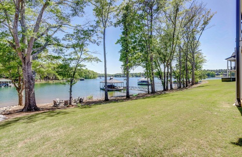 Welcome to what is unquestionably one of the premier vacation rentals on Lake Keowee. Brand new high end home with all top of the line construction and designed to maximize the amazing view of Lake Keowee. Home is situated on a flat lot, a mere 50 feet from the shores of Keowee. This results in an amazing combination of wonderful expansive 180+ degree lake views, but minimal effort to get to and from the huge 1000 square foot covered dock, with 12-15 feet deep water at the dock. The lot is also at the entrace to a cove with a no-wake buoy, so there is minimal boat traffic or waves to deal with, leading to a very peaceful serene experience. Although the home is in a cove, it still has a huge amazing Lake Keowee view! The home boasts 5 large private bedrooms, all with ensuite baths, and two huge living areas, on three separate levels, so there is plenty of privacy, but also plenty of space for gatherings. We have just added a bunk room with two twins over two queens, a perfect kid's space. 6th full bathroom also on the lower level. The home has also maximized the outdoor living areas, with over 1200 square feet of covered patio and deck space and 2 outdoor stone fireplaces with gas logs.