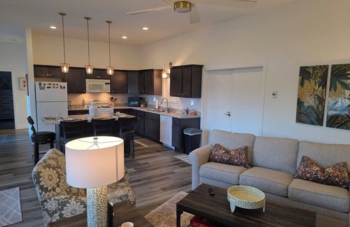 * Full kitchen with modern appliances including dishwasher, coffee maker, and toaster oven.