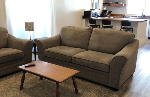 This is a brand new custom built private suite, built in 2023, with lots of natural bright light, spacious living and dining area, a large bedroom and bathroom, & a private enclosed patio with its own gate. This fully separate guest suites is backed onto our garage - and mudroom. Our living quarters are entirely upstairs, and we don't use the ground level for anything but entering and exiting. We are a quiet, mature marries couple with no children, and one small quiet, non-yappy dog that lives with us.