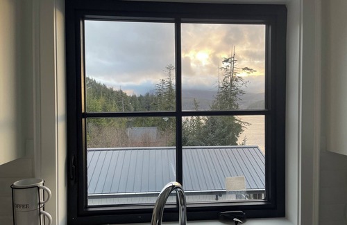 Brand new studio coach house suite, situated over a garage, has its own private entrance. Enjoy stunning views of the ocean and even more beautiful sunsets from your suite. Full kitchen with dishwasher, electric stove, microwave, fridge/freezer and coffee maker. Suite includes a stacked washer and dryer. Enjoy a cup of coffee or wine on your own private deck, and if you are lucky you may even see pods of whales swim by. Please note that the parking area is shared with guests of the main house. Located a short 5 minute walk away to historic Telegraph Cove resort and marina where you can book a whale watching tour or rent a kayak.