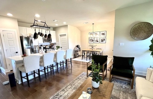 Welcome to your luxurious home away from home outside Austin, Texas! This brand new home in a quiet neighborhood and is professionally decorated in a Modern Organic style. There is a large outdoor patio and large fire pit area - s'mores included! Kitchen is stocked with breakfast items, snacks, coffee, pots, pans, and everything you need for cooking. The park and playground at the end of the street (four houses down!) will keep the kiddos happy.
