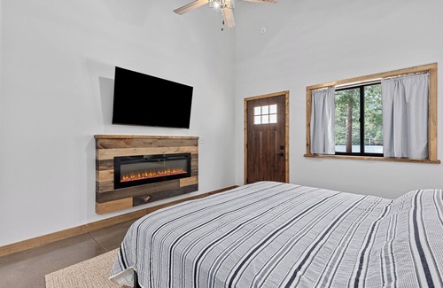 Air conditioning and heat are provided by the new mini split unit. Heat is supplemented by the large electric fireplace, however, it can be used without heat to add the warmth of ambiance without the increased temperature. The ceiling fan helps keep things comfortable too.