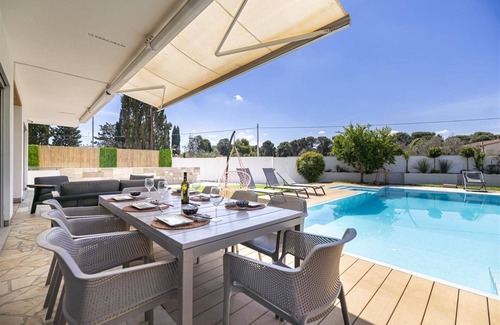 At the entrance the villa has a modern and large living room with sofa, TV, desk and fireplace, next to it we find the modern and bright kitchen with table, chairs and large windows overlooking the swimming pool and the equipped garden. 3 modern bedrooms (two doubles and one twin) equipped with every comfort, 1 bathroom with shower. Air conditioning in every room, mosquito nets in the sleeping area. Sleeps 6. No pets allowed.