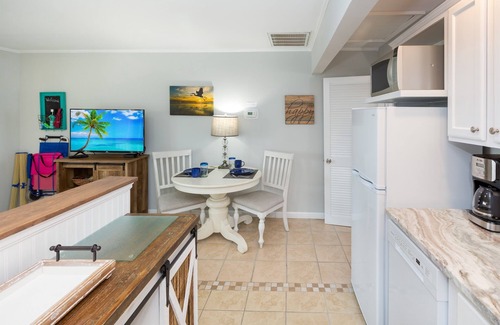 The first thing you'll notice is all the bright natural light that comes into this condo. In fact, it is the only property in the complex with windows on three sides. Enjoy watching palm trees swaying in the breeze, seeing the "ocean peek" view in the distance, listening to the rush of the waves, and taking in silent morning sunrises....all from your front door! The living room has a comfy queen-sized sofa-bed with memory foam mattress and a natural wood woven chair. Enjoy the large screen SMART tv with cable and for some family fun, check out the books and games stocked in the entertainment center. Owner has provided a beach cart for bringing your chairs to the beach, or, feel free to bring along the ones offered for guest use. Other provisions include beach mats, flashlights, and umbrellas.