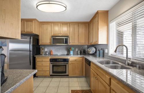 The main floor features a comfortable living room with a propane fireplace, recliner and sectional sofa. Here you will find a Smart TV with many streaming options, along with a soundbar and Blu-ray player. You will find a selection of books, games and DVD's for your use. The well stocked kitchen provides ample opportunity to cook (although there are many nearby restaurants). The kitchen coffee bar features both a Keurig pod coffee maker along with a Cuisinart coffee maker and coffee pods. Here we have an Echo to provide news and music for the chef. We also offer great pots and pans, bakeware, wine and champagne glasses. The dining table seats six. There is a 1/2 bath on the main floor.