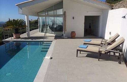 Exquisite contemporary 2 bedroom villa ( 2 en-suite) with a non-traditional architecture with smooth white exterior walls and traditional terracotta roof tiles. The property is reached by a private road and is located on the hillside above the picturesque medieval village of Tourrettes sur Loup. it is within walking distance (450meters). It has an excellent position overlooking the village with sweeping panoramic views over the sea, from Cap Ferrat to the Esterel Mountains. The villa is in a prestigious location in a very beautiful natural environment.. Extensive south east-facing terrace that includes a heated infinity pool with a terrace and dining area. The terrace is running the entire length of the house, overlooking the breathtaking view - possibly the best in the area. Garden furniture and sun loungers. High quality beds, linen and towels provided. Shops, restaurants and services in the local village (distance 0.5 km). Underfloor heating and air conditioning in the living areas . The property has ample parking for 3 cars. Pool Will be heated until the end of September .