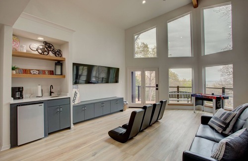 Enjoy breathtaking views while relaxing and laughing with family and friends. This is the perfect get away for making lasting memories. Whether you decide to launch your boat and venture to the lake, enjoy the tri-level pool at Tanglewood Resort, play a round of golf, grab a coffee and head to downtown Denison for shopping and wine tasting, or relax at the house to fire up the grill on the patio, you will not be disappointed. The house is fully stocked with all the necessities needed to feel right at home including, 7 smart TVs throughout, fully stocked kitchen with duel refrigerators, a fire pit, pool table, ping pong table, air hockey, and various board games. Your kiddo's can even bring their gaming systems and connect to the duel T.V.'s in the game room. Don't feel like cooking? No problem! Tanglewood Resort, seasonal restaurants at Highport Marina, Arroyos, Bay at the Lake, Franks, and Napolis are just minutes away. If you want to venture a little further, Choctaw Casino is just 30 minutes down the road.