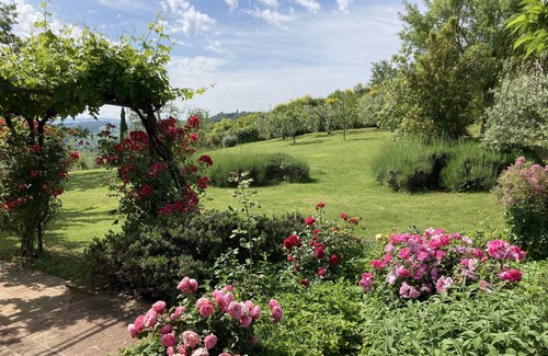 The vast panoramic park on the two valleys to the east and west surrounds the house, protected by both an alarm and videocameras to enjoy a safer relaxed stay. The aromatic plants, roses, tall trees, make the garden particularly suitable for relaxation and artistic inspiration! There, you will find several tables with chairs for dining under the grape pergola and deck chairs to rest in the sun.