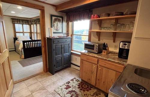 Inside this well-laid-out studio apartment, you will find everything you need for your short stay in the area. The studio living space has a queen bed, a comfy couch, a 50" ROKU SmartTv, a dining area, and a twin bed. Immediately adjacent to the living area is a perfect kitchenette with natural light from the window, open shelving to make the space feel larger, and even a 2 burner electric stovetop, mini fridge, coffee pot, and microwave. This little kitchenette is just right for your time away from home.