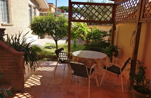 Prices are shown for the entire property, possibility of discounts for two people. Tourist rental of a portion of a garden-level villa with independent pedestrian entrance, independent driveway with internal parking space; large garden, living room with piano, kitchen corner, bedroom with a double bed and possibility of adding a third bed, electric massage chair, two bathrooms, one with a bath and one with a shower; at 500 m. from the stops to reach Ostia l'EUR and Casalpalocco, surrounded by the pine forest of Castelfusano.