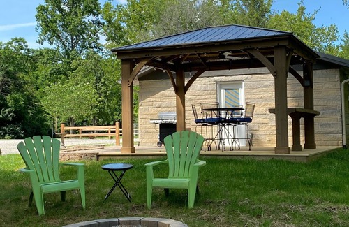 The Bridge-view suite is an end unit with views to the nearly 200 year old covered bridge at the entrance to the Cataract Falls State Recreation Area. This Suite is one of three Suites in the lodge that can be rented individually or combined. The suite sleeps up to 4 people in a luxurious setting with a kitchenette to rival the best a fancy hotel suite has to offer. In addition to a comfortable interior this suite like every suite in the lodge has its own personal outdoor accommodations with pavilion, fire pit and gas grill. Sit outside and gaze over rolling hill at the parks entrance and listen to the falls in the background.
