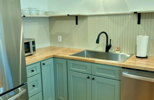 The kitchen is fully stocked with the essentials for eating in and has plenty of storage for pantry items if booking a longer stay. A concrete patio just outside the cabin has an area for dining and grilling.