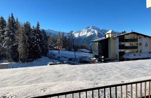 The holiday apartment is located in a well-kept apartment building on the northern outskirts of Mösern on Albrecht-Dürer Weg in a fantastic panoramic location, with a clear view of the Tyrolean mountain landscape. Both the living room and the bedroom face south and offer a great view of the beautiful nature of Mösern through the large window fronts, which were renovated in 2021 and equipped with electric external blinds. Both rooms lead to the 15 m² covered terrace.