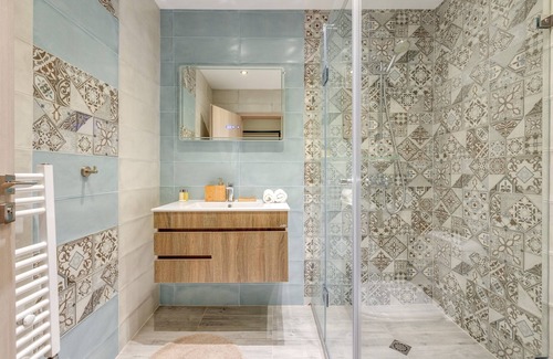 The bathroom is modern and fully functional filled with fresh towels and full amenities set.