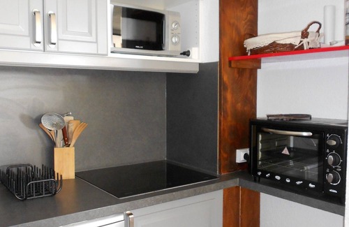 The spacious living room is equipped with a sofa, a flat-screen TV, a table for 6 guests, and has access to a large balcony offering breathtaking views of the slopes. The kitchenette is equipped with a mini oven, a microwave, a dishwasher, a ceramic hob, an electric coffee maker, a Nespresso® coffee maker, and a toaster.