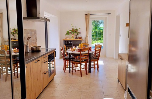 Stay from 3 nights: arrival 5 [hidden] - Departure 10 [hidden] Independent house. On the ground floor: living room 32m² with lounge, TV, wood stove and dining area - Bedroom 1 of 15.5m² with 2 twin beds 80*200, office, storage, with bathroom of 4.5m², shower and sink and private toilet - Equipped kitchen 20m² with refrigerator, freezer, electric hob, oven, dishwasher, microwave, toaster, filter coffee maker, kettle - Back kitchen with washing machine and dryer - Children's playroom equipped with TV, video cassette player, board games, dinette, dolls... separate toilet.